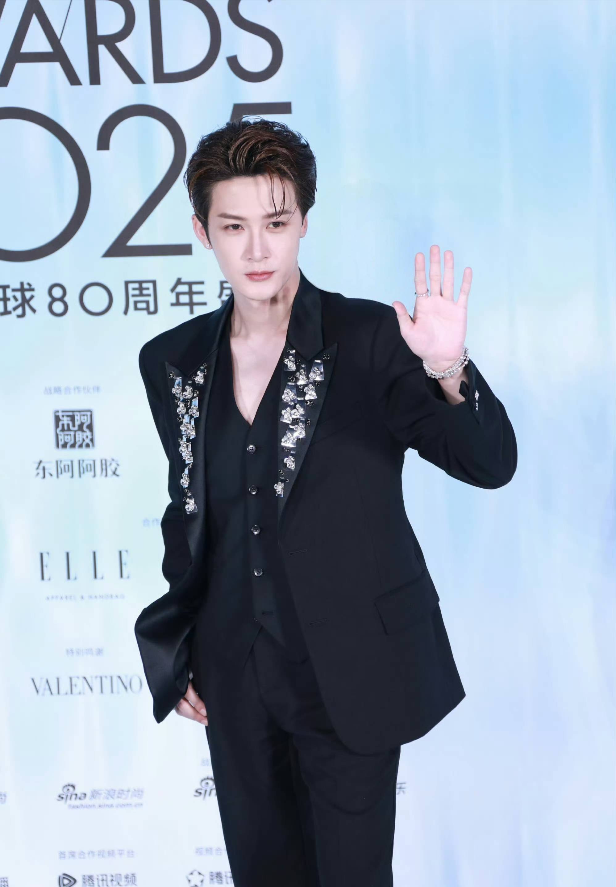 其实这套造型的“蝴蝶效应”设计藏着不少巧思。摄影师拍摄时特意利用光影在深V领口投射出蝴蝶翅膀的影子,配合丝绒面料的光泽,静止时像标本里的蓝闪蝶,走动时钻石项链随动作晃动,又像蝴蝶振翅欲飞。工作室花絮曝光,为了项链佩戴角度,造型师和品牌方争论了三小时,最终檀健次亲自将项链向左偏15度,“这样走路时钻石会像星星在飞”。这种对细节的执着,让时尚博主感叹“他把红毯走成了个人艺术展”。